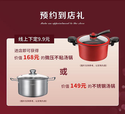 第一重好禮——預(yù)約到店有禮,線上下定9.9元,進(jìn)店即可獲得價(jià)值168元的微壓不沾湯鍋或價(jià)值149元的不銹鋼湯鍋。