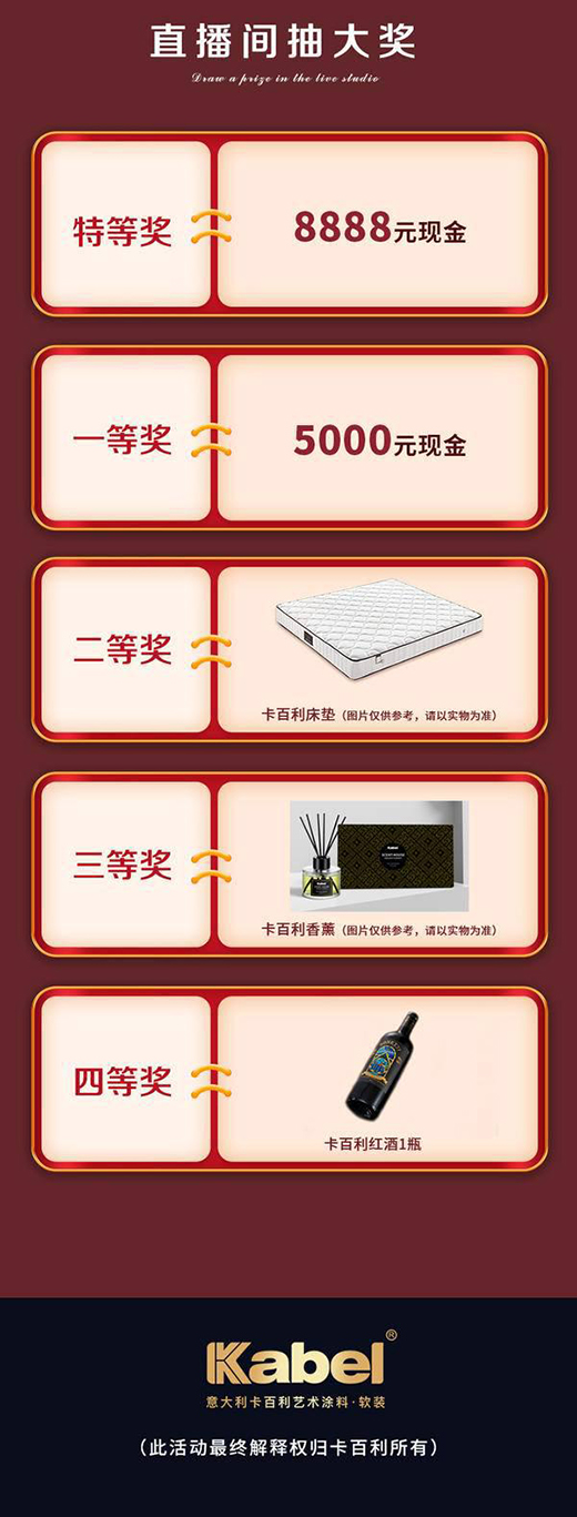 第四重好禮——線上秒殺,5月20日晚19點(diǎn)30分,卡百利將在官方微商城,抖音等大型平臺(tái)同步開(kāi)啟直播活動(dòng),直播期間,將有多重好禮相送,還有直播間紅包不定時(shí)放送,讓您的家裝更超值,不能錯(cuò)過(guò)!