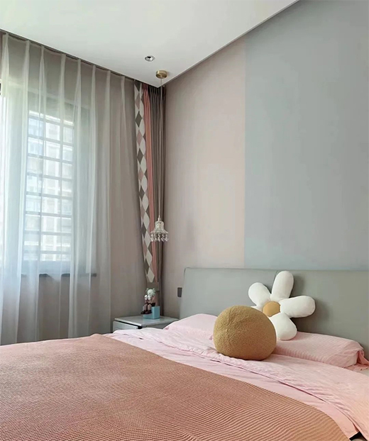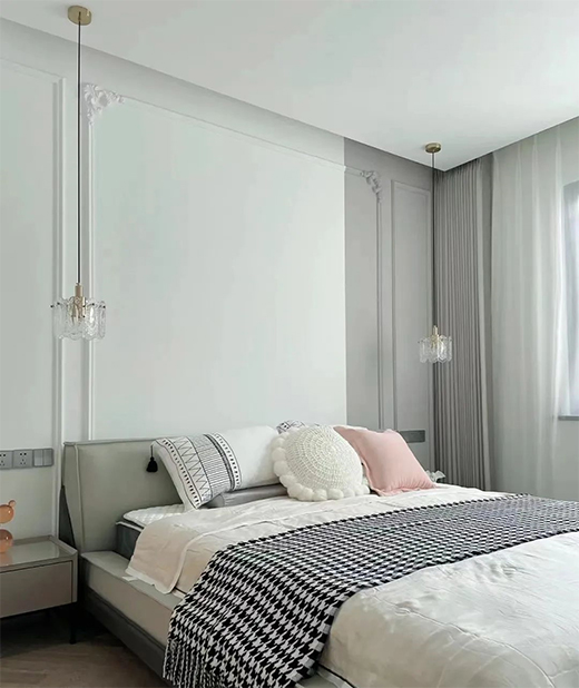 主臥背景墻可以選擇高端絲綢質(zhì)感,光澤細膩溫柔,整體搭配舒服舒適,透露出一絲優(yōu)雅氣息。