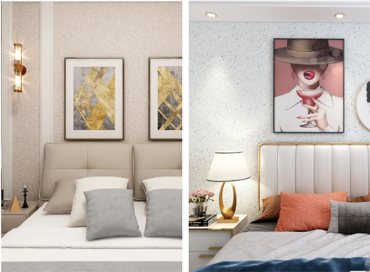 臥室是家里最讓人放松的地方。彩片貝殼般的光澤,讓您的墻面擁有彩虹般的光彩,使家居空間擁有璀璨矚目的藝術(shù)效果。