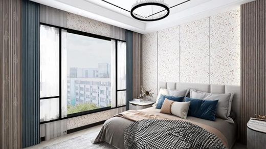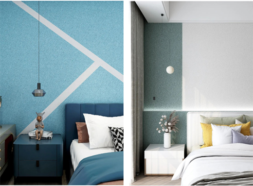 在臥室裝潢中,床頭背景墻用藝術(shù)涂料裝飾,不僅擁有豐富的肌理和圖案,色彩多樣,而且搭配床品、柜子等臥室軟裝,就能把臥室設(shè)計得時尚又耐看。