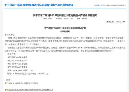 根據(jù)《關于組織申報廣東省2019年高新技術產(chǎn)品認定的通知》(粵高企協(xié)〔2019〕8號)的要求,經(jīng)企業(yè)申報、專家評審等規(guī)定程序,2019年廣東省高新技術產(chǎn)品認定評審工作已完成。高速干式復合機等33030項產(chǎn)品擬認定為廣東省高新技術產(chǎn)品。