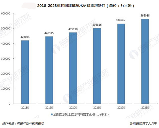 根據(jù)有關(guān)部門統(tǒng)計(jì),目前國內(nèi)65%的新建房屋投入使用1-2年內(nèi)都會(huì)出現(xiàn)不同程度的滲漏,滲漏占房地產(chǎn)質(zhì)量投訴的65%,65%的建筑防水工程6-8年后需要翻新。無論是新房裝修還是舊屋翻新,衛(wèi)生間、屋頂、地下室、陽臺(tái)、窗戶、廚房、外墻等都存在著巨大的防水工程需求。據(jù)《前瞻經(jīng)濟(jì)學(xué)人》統(tǒng)計(jì)預(yù)測,2023年中國建筑防水材料的市場規(guī)模將會(huì)達(dá)到56.60億平米。