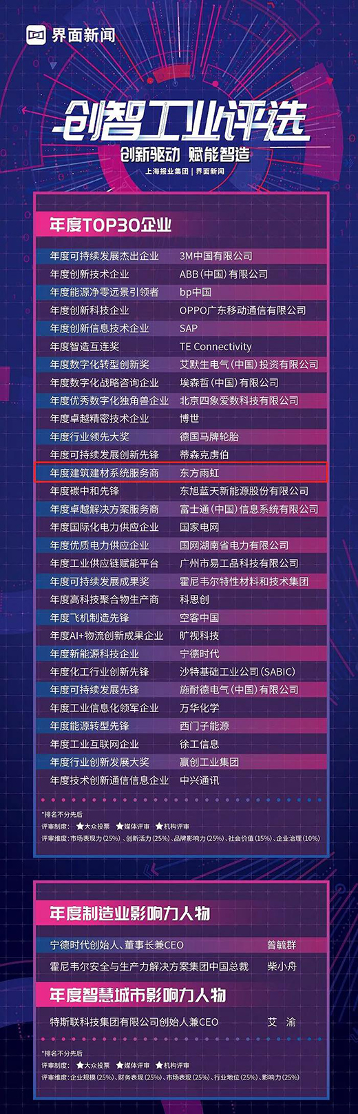 9月16日,“2021界面創(chuàng)智工業(yè)論壇”在上海舉行,論壇聚焦數(shù)字化時代的產(chǎn)業(yè)升級與變化,以“創(chuàng)新驅(qū)動,賦能智造”為主題,共同探討“碳中和”時代企業(yè)低碳轉(zhuǎn)型的機遇與挑戰(zhàn)?;顒油趯χ袊I(yè)在蛻變當(dāng)中涌現(xiàn)的創(chuàng)新企業(yè)、產(chǎn)品及服務(wù)進行表彰,現(xiàn)場公布了“2021創(chuàng)智工業(yè)評選”獲獎名單,東方雨虹榮獲“年度建筑建材系統(tǒng)服務(wù)商”。