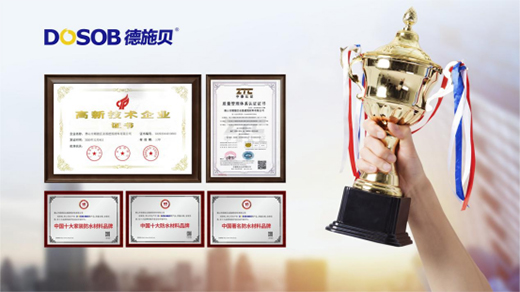 德施貝自成立來憑借過硬的產(chǎn)品,自主研發(fā)的技術(shù),陸續(xù)通過“ISO9001:2008質(zhì)量管理體系”、“中國綠色建材產(chǎn)品推廣”、“中國建材首選品牌”、“國家建材AAA級質(zhì)量服務(wù)體系”等認(rèn)證,并在《中國品牌網(wǎng)》舉辦的“行業(yè)十大品牌評選盛典”活動中一舉奪得“中國十大防水材料品牌”、“中國十大家裝防水材料品牌”、“中國著名防水材料品牌”三大榮譽(yù)。