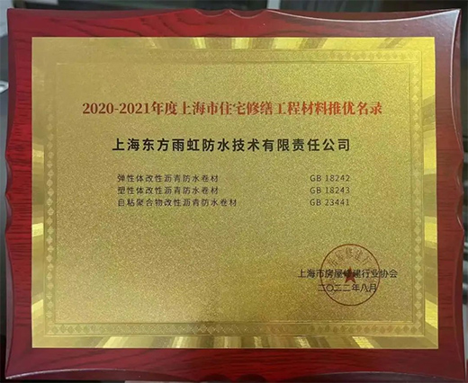 8月,上海市房屋修建行業(yè)協(xié)會(huì)頒布《2020—2021年度上海市住宅修繕工程材料推優(yōu)產(chǎn)品入選名錄》,上海東方雨虹防水技術(shù)有限責(zé)任公司三款優(yōu)質(zhì)防水類產(chǎn)品——彈性體改性瀝青防水卷材、塑性體改性瀝青防水卷材、自粘聚合物改性瀝青防水卷材成功入選。