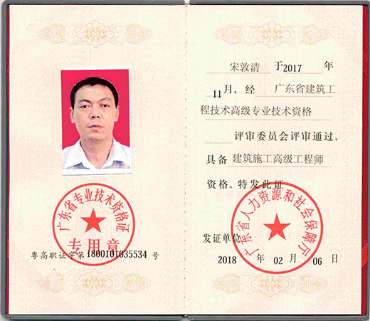 近日,經(jīng)廣東省建筑工程技術高級專業(yè)技術資格評審委員會評審,青龍公司董事長宋敦清先生成功通過評審,獲得建筑施工高級工程師資格。