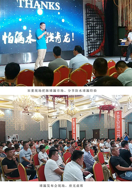 慶典期間還召開了青龍家裝防水補(bǔ)漏新產(chǎn)品發(fā)布會(huì)。青龍防水董事長(zhǎng)宋敦清親自為大家分享行業(yè)走勢(shì)和青龍?zhí)厣侣┬缕?。宋董首先?jiǎn)要分析了當(dāng)前全國(guó)建筑補(bǔ)漏的現(xiàn)狀及市場(chǎng)前景,強(qiáng)調(diào)2018年很多防水廠家都在布局堵漏市場(chǎng),對(duì)防水創(chuàng)業(yè)者而言,現(xiàn)在正是契入建筑堵漏市場(chǎng)的最好時(shí)機(jī),先進(jìn)入者也將獲得更多優(yōu)勢(shì)。然后對(duì)青龍全能防水膠、青龍3號(hào)、砼1號(hào)、砼2號(hào)等特色維修補(bǔ)漏產(chǎn)品進(jìn)行了詳細(xì)的講解,拓展了大家建筑修繕視野,也提高了對(duì)舊房維修補(bǔ)漏技術(shù)和自信心。