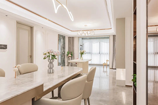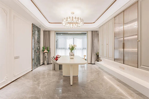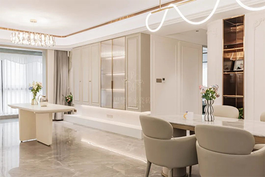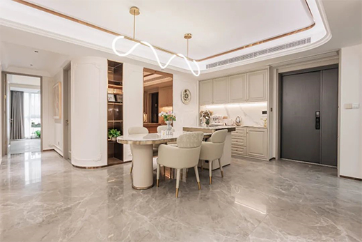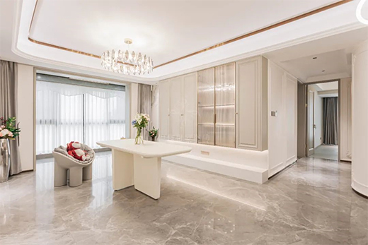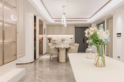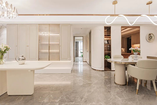 本案例整體以奶白色調(diào)為主,輔以巴黎世家瓷磚將法式的輕奢質(zhì)感和浪漫情懷融入室內(nèi)設(shè)計(jì)中。在設(shè)計(jì)師的巧思妙想下,巴黎世家瓷磚薩羅尼克的優(yōu)雅大氣、艾倫灰的浪漫格調(diào),搭配法式輕奢理念,完美地詮釋了輕奢高級(jí)的家居氛圍,同時(shí)讓人對(duì)精致生活有著無(wú)限憧憬。