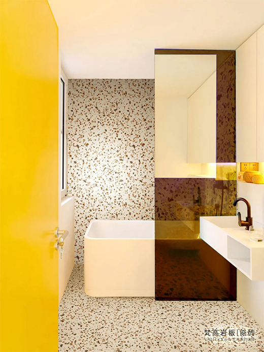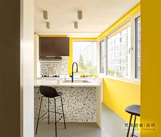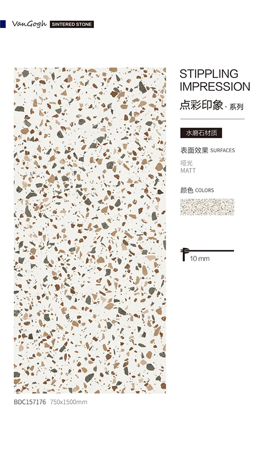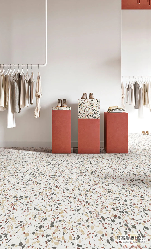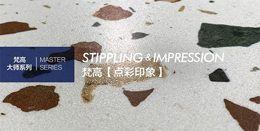 梵高【點(diǎn)彩印象】,從修拉的作品中獲取靈感,將「點(diǎn)彩藝術(shù)」技法融入到「彩色水磨石」肌理的重構(gòu)當(dāng)中,不規(guī)則的純色顆粒,像油畫色點(diǎn)散落在磚面,看似漫不經(jīng)心,實(shí)則色澤、大小和分布均經(jīng)由精心設(shè)計(jì),繽紛爛漫,又富于藝術(shù)氣息。