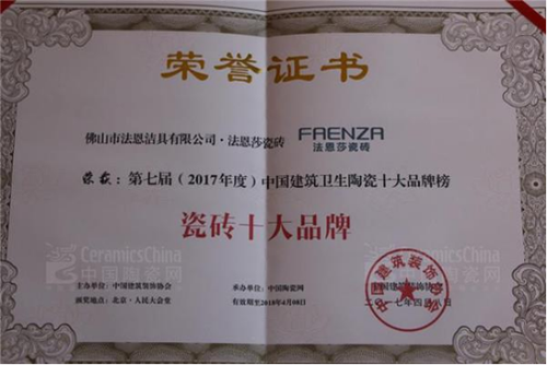 法恩莎榮獲“陶瓷十大品牌,瓷磚十大品牌”