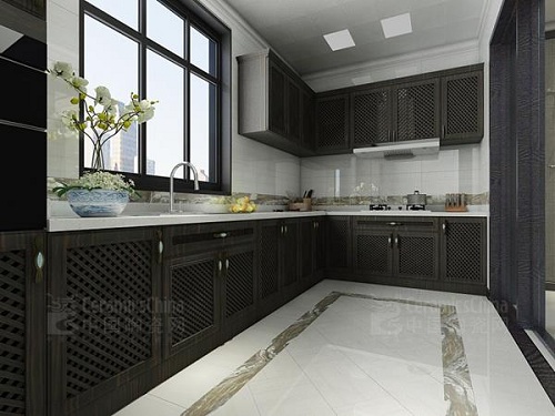 良好的采光讓廚房明亮自然,該款箭牌瓷磚表面淺淺的藍(lán)色與白色條紋重巒疊嶂,仿若悠遠(yuǎn)的海洋,清亮如水,層次感分明,給人一種舒適清涼的自然感。臺柜上的鮮花裝飾,將室外的春光明媚帶到室內(nèi),讓廚房的烹飪時光,伴隨著點(diǎn)點(diǎn)優(yōu)雅之意。