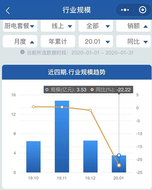其中,下跌較為明顯的是廚電套餐,1月線上銷售同比下降22.22%,油煙機同比下降15.65%,燃氣灶同比下降5.06%。