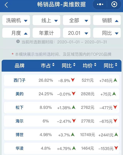 洗碗機西門子下跌最多,華凌升幅最快。1月線上洗碗機行業(yè)總體不錯,銷售規(guī)模1.6億元,同比增長14.53%。是上述四個廚電品類中唯一雙位數(shù)增長的。其中,在市場占有率方面,西門子(26.82%)、美的(24.25%)、松下(8.93%)、海爾(6%)、博世(4.98%);在同比增長方面,出人意料的是華凌同比增長最快,達到4.79%。