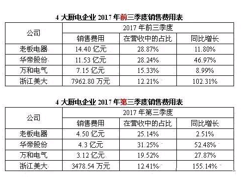 在2017年第三季度報告中,浙江美大指出,企業(yè)銷售費用的增加,主要系報告期廣告宣傳費用增加所致;華帝股份則表明,企業(yè)銷售費用的增加主要系品牌提升、渠道拓展及銷售收入增加致廣告費、促銷費等增加所致。