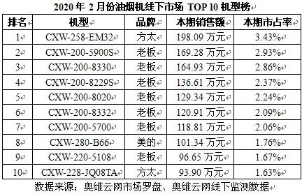 從奧維云網(wǎng)發(fā)布的數(shù)據(jù)來看,這兩個(gè)月里,線下市場油煙機(jī)銷售額最高的10款產(chǎn)品,仍然來自方太和老板這兩大品牌,其他品牌只有美的在2月份的“10強(qiáng)機(jī)型”中搶占了一個(gè)席位。