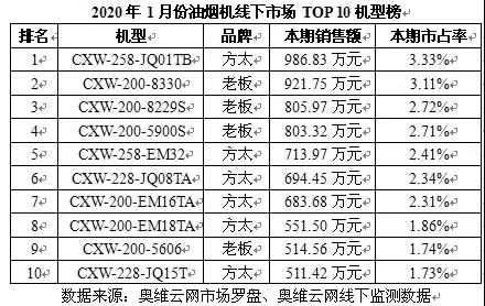 1月份線下市場銷售額最高的10款油煙機(jī)中,方太占6款,老板占4款。當(dāng)月線下市場銷售額最高的油煙機(jī)產(chǎn)品,是方太“CXW-258-JQ01TB”型油煙機(jī),銷售額為986.83萬元,市占率為3.33%。