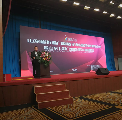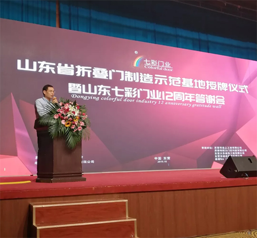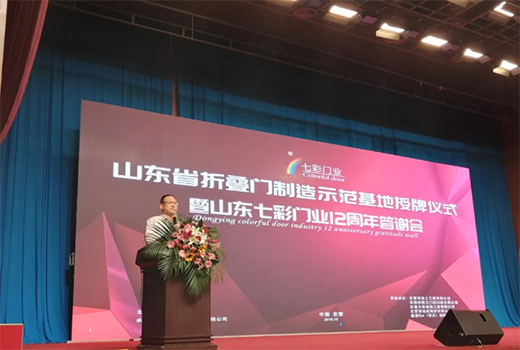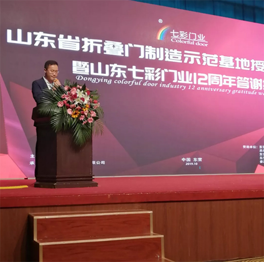 山東省門(mén)業(yè)協(xié)會(huì)會(huì)長(zhǎng)周?chē)?guó)青先生上臺(tái),代表協(xié)會(huì)向山東七彩門(mén)業(yè)獲得“山東省折疊門(mén)制造示范基地”表示祝賀,對(duì)七彩門(mén)業(yè)在山東省折疊門(mén)制造領(lǐng)域取得的成績(jī)表示肯定。