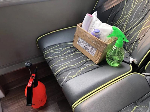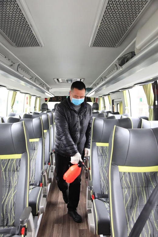 李師主要工作是駕駛公司交通車,負責每天接送員工上下班。當下為了做好新冠肺炎疫情防控工作,李師5點過就得起床提前做好一系列的防護。先是和尋常一樣對車進行安全檢查,確保安全無患;然后給交通車內(nèi)外全面消毒消菌,保證防控到位。雖然交通車每天就承載員工上下班的幾十分鐘,李師卻要消毒三次,每一個座位、每一處扶手都細心全方位的消殺,不放過每一處細節(jié)。