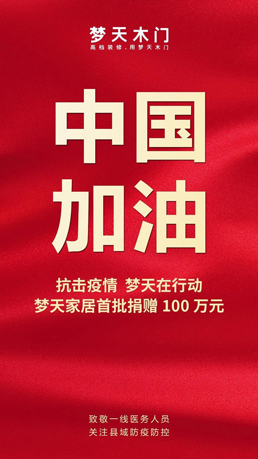 中國(guó)木門(mén)企業(yè)心系疫情,中國(guó)林產(chǎn)工業(yè)協(xié)會(huì)木門(mén)窗產(chǎn)業(yè)分會(huì)輪值理事長(zhǎng)單位夢(mèng)天家居集團(tuán)股份有限公司在獲悉疫情后,第一時(shí)間成立疫情防控專(zhuān)項(xiàng)小組,時(shí)刻保持著對(duì)疫情動(dòng)態(tài)的及時(shí)關(guān)注,在關(guān)注員工健康與安全的同時(shí),建立敏銳的前中后端聯(lián)動(dòng)與預(yù)案機(jī)制,確保能夠滿足用戶(hù)的服務(wù)與交付需求。
