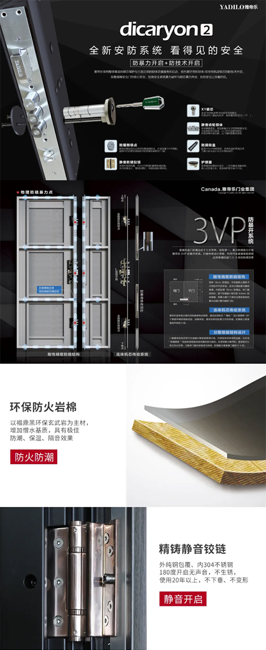 門體內(nèi)采用3VP防暴開系統(tǒng),打破傳統(tǒng)設(shè)計原理,利用汽車碰撞吸能原理達到普通防盜門2-3倍的防撬效果。鎖具采用Dicaryon全新安防系統(tǒng),防暴力開啟+防技術(shù)開啟,安全讓您看的見。油漆采用進口環(huán)保生態(tài)漆,融合納米金屬顆粒技術(shù),有效解決油漆脫落、發(fā)黃變舊難題,讓漆面始終光亮如新。