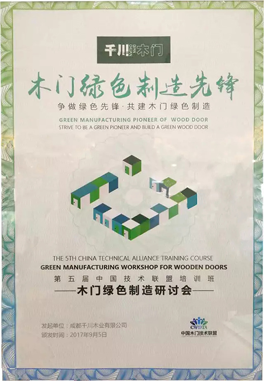 2017年,千川榮獲中國木門技術聯(lián)盟“木門綠色制造先鋒”稱號。