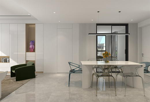 作為客廳視覺(jué)延續(xù)的開放式廚房,餐桌選擇與整屋裝修色調(diào)統(tǒng)一的白色,以亮眼的桌椅點(diǎn)綴空間,使整個(gè)餐廚區(qū)域與客廳區(qū)域更加協(xié)調(diào)。