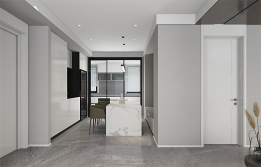 柜門與室內(nèi)門選用同一材質(zhì),讓室內(nèi)空間更為流暢。長(zhǎng)島臺(tái)一體設(shè)計(jì),為親友聚餐增加就餐空間的同時(shí),也能化身小戶型的辦公區(qū)域,讓一杯手沖咖啡的香氣,打造格調(diào)感十足的居家辦公氛圍。