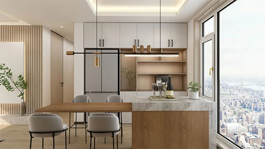 靠窗搭建島臺(tái)操作區(qū),為整個(gè)餐廚客區(qū)域帶來(lái)開闊視野。通頂木質(zhì)壁柜搭配內(nèi)嵌式冰箱,滿足儲(chǔ)物空間的同時(shí),提高餐廚客的整體層次感。