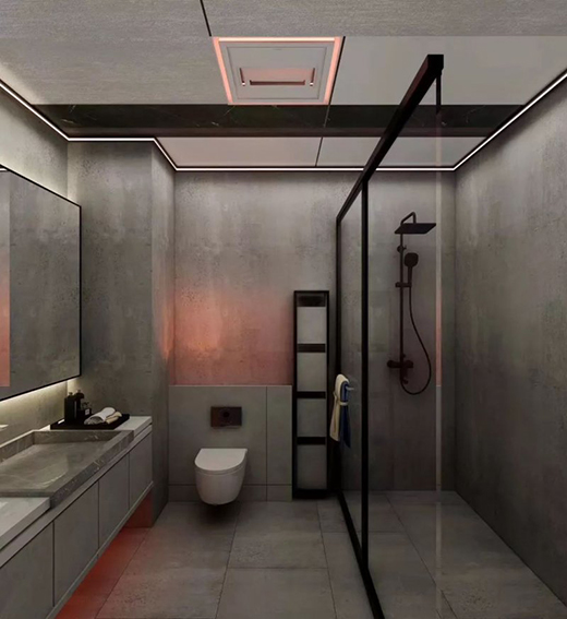 奧華御尊1號浴室暖空調浸入式體驗,取暖時從淡雅粉到橙紅色漸變,舒適溫暖加倍呵護,吹風時從天空藍到湖藍色氛圍光,換氣時湖綠色氛圍光,功能反饋播報,讓光也懂四季冷暖。