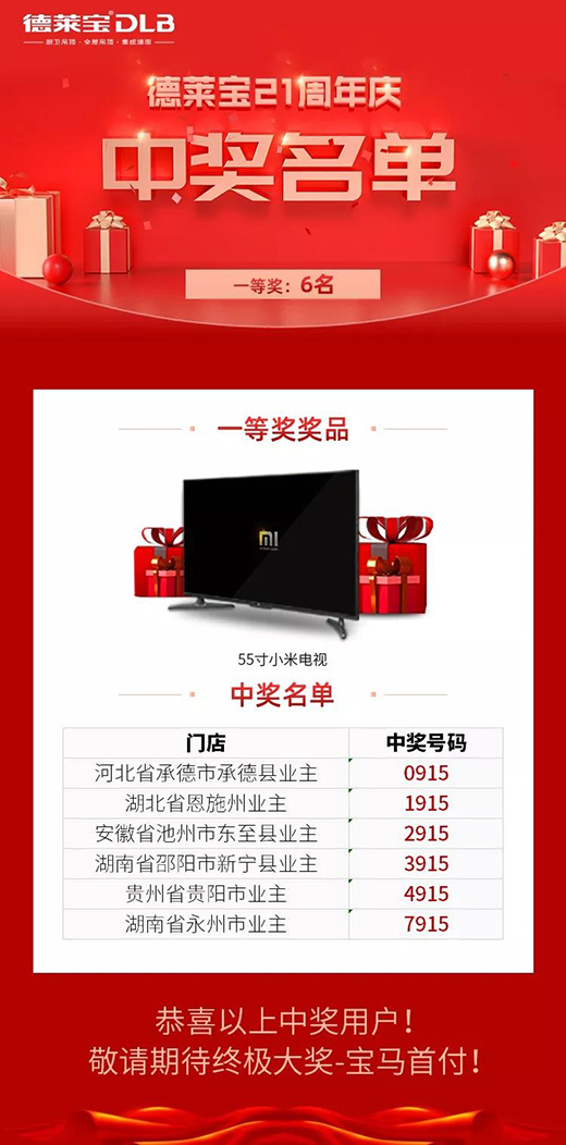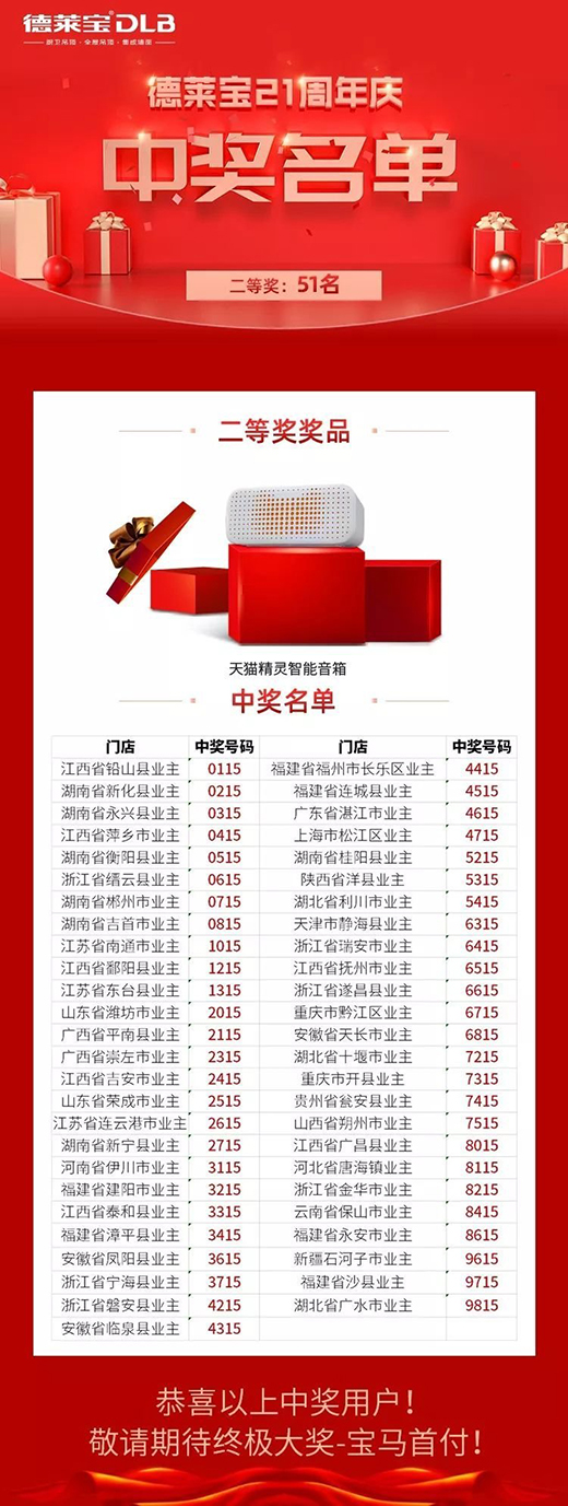 別說不信,上千家德萊寶授權專賣店同步開啟21周年慶活動,截至11月11日晚,第二期中獎名單也已出爐啦,所有中獎號碼都是根據(jù)11月11當晚,中國體彩排列5的開獎結果產生的哦,無貓膩、無內幕、全公開!一起來看看,有哪些幸運寶寶中得大獎啦。