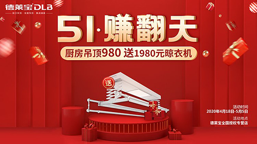 安好家,住新家!即日起至2020年5月5日,去德萊寶專賣店,就能享受好而不貴的頂墻臻品~ 980元購廚房套餐,就能免費獲得1980元的高端智能晾衣機一臺哦~50000臺限時限量!!!