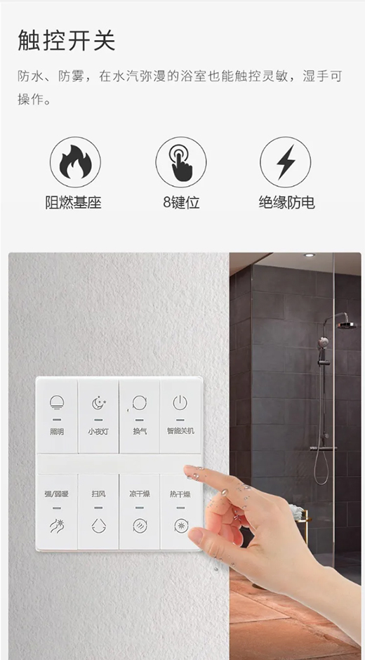 M12擁有弱暖和強(qiáng)暖雙檔控溫,采用大功能ptc取暖,能讓人們瞬間享受溫暖。M12智能測出風(fēng),讓風(fēng)暖更顯溫柔。M12電機(jī)采用江南滾珠,速轉(zhuǎn)高,升溫快,噪音低。讓人們在沐浴之中聽到水流聲帶來的美妙旋律,靜靜的享受。沐浴的水汽會(huì)導(dǎo)致環(huán)境潮濕,所以人們會(huì)擔(dān)心開關(guān)觸電。M12采用觸控開關(guān),阻燃基座絕緣防電,觸控靈敏,濕手也可操作,安全又放心。