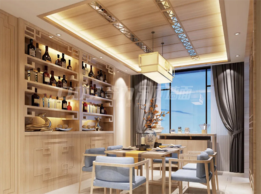 采用自然木紋定義空間主色彩,清新中又不乏復(fù)古格調(diào)。木紋吊頂?shù)募尤?,既豐富了空間造型,又提升了視覺層次。