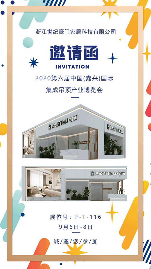 2020第六屆中國(guó)(嘉興)國(guó)際集成吊頂產(chǎn)業(yè)博覽會(huì)暨中國(guó)·頂墻集成大會(huì)9月6日-8日浙江嘉興國(guó)際會(huì)展中心世紀(jì)豪門展位號(hào):F-T-116