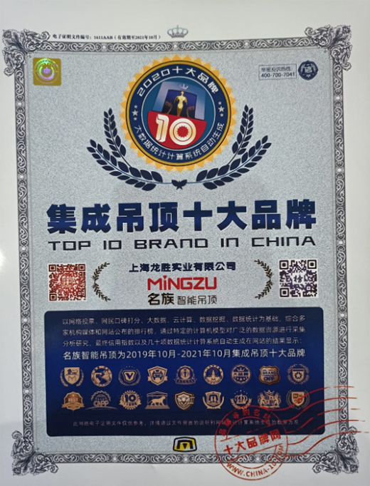 喜報 | 名族榮獲2020年集成吊頂十大品牌!