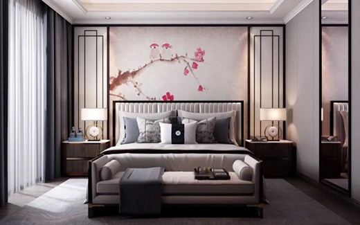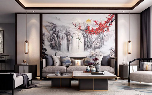 鴻運銘居將現(xiàn)代元素與傳統(tǒng)元素靈活的結合在一起,打造出一種符合現(xiàn)代審美觀念的背景墻。一副充滿中式風格的藝術畫,以高山流水、紅梅仙鶴勾勒出恢弘之勢,意境悠遠,展大家風范。