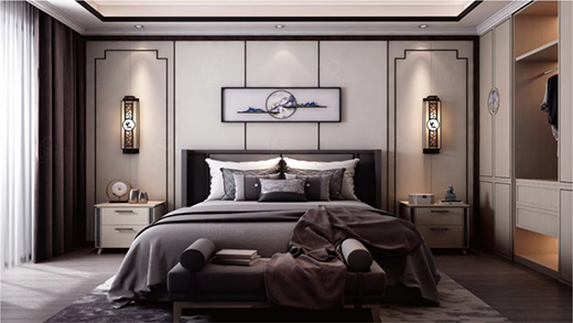 沁園雅韻采用后現(xiàn)代的手法,把傳統(tǒng)的結構形式通過重新設計組合,以素雅的墻板為基底,輔以造型框裝飾和裝飾線條的勾勒,居中位置懸掛一副中式山水畫,將中式的禪意表現(xiàn)的淋漓盡致。這經(jīng)過歲月沉淀的古韻之美與書卷之氣,使我們浮躁的心得以舒緩和安放。