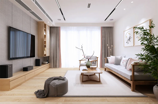 在客廳與陽臺打通情況下,如果窗簾是靠陽臺安裝的話,那么就可以在電視墻與沙發(fā)墻上做二字型的吊頂設(shè)計,然后根據(jù)空間的利用與外機(jī)位置,把中央空調(diào)安裝在一側(cè)的吊頂里面。