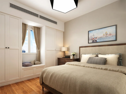 臥室是家中最重要的休息空間,整體的舒適性和美觀性一定要強(qiáng),可以利用臥房房門上方的吊頂安裝,采用側(cè)送下回的送風(fēng)方式,讓空調(diào)和裝修風(fēng)格更統(tǒng)一。