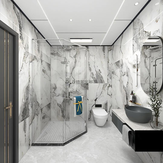 井然有序的大板吊頂,大理石紋的質(zhì)感墻磚,以極簡的視覺設(shè)計塑造空間。簡約的大板吊頂適配T9高端浴室暖空調(diào),使顏值與功能在浴室里達(dá)成品質(zhì)契約。