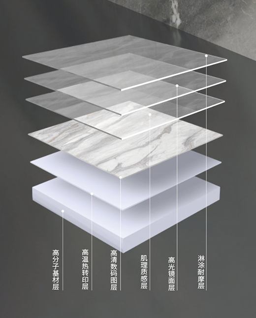 超薄人造石基材,是以天然大理石粉與食品級樹脂,為主要原料,經(jīng)高溫高壓擠出制作而成。裝飾面層,運用高清數(shù)碼打印技術與熱轉印技術實現(xiàn)逼真紋理,再增加保護紋理的釉晶淋涂固化層,更抗刮耐磨。