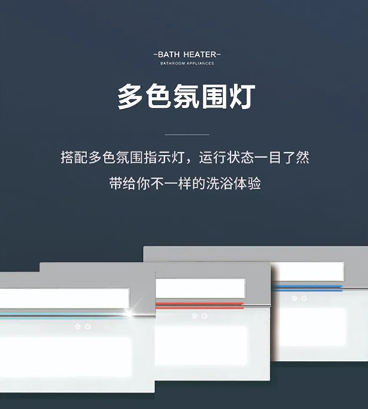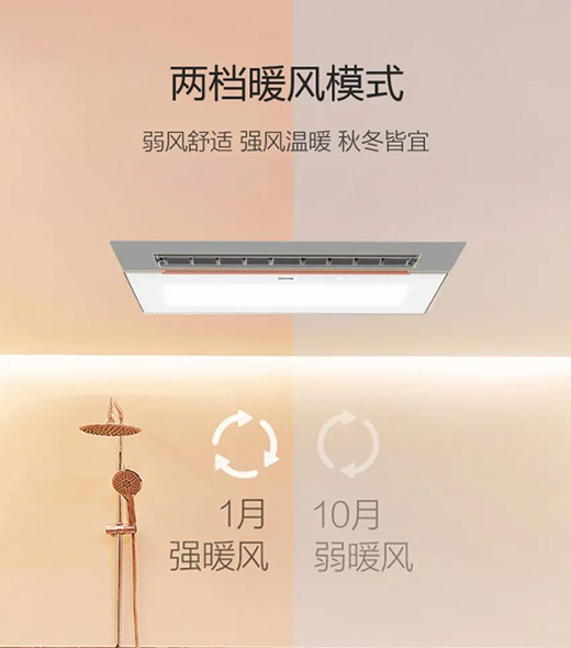 冬日取暖,紅色LED燈亮起,增加溫暖;夏日吹風(fēng),湛藍(lán)色LED燈亮起,清涼一夏;換氣時(shí),LED燈變?yōu)樗{(lán)色,清爽舒適。