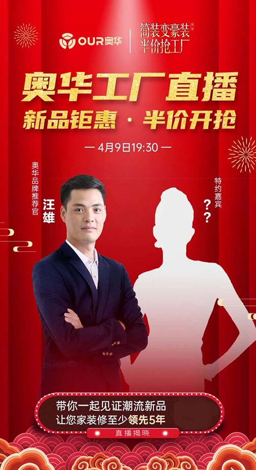 4月9日晚19:30,奧華簡裝變豪裝·半價搶工廠直播間新品聚惠半價搶!本次活動由奧華品牌推薦官汪雄先生攜手神秘嘉賓親自放價,為直播間的客戶送上聚惠福利。