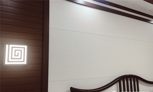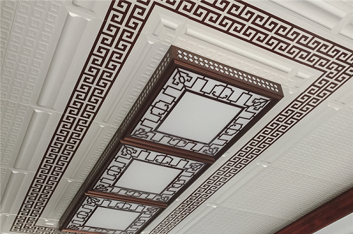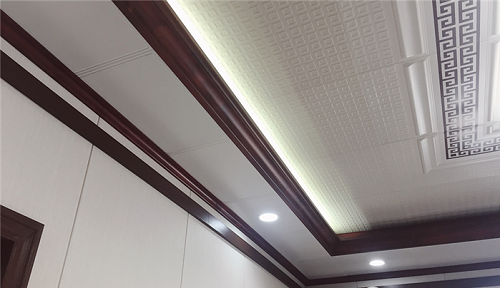 ▲ 它的吊頂采用了愛爾菲雅居系列的扣板,最中心部位雅居直邊+轉(zhuǎn)角邊拼接,燈具是很貼合整體風(fēng)格的中式吸頂燈。