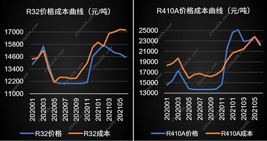 據(jù)產(chǎn)業(yè)在線統(tǒng)計,2020年以來,熱門產(chǎn)品R32單噸虧損2000千元上下,而R410a也是受到今年的政策影響才進(jìn)入止損區(qū)間,市場倒掛現(xiàn)象明顯。