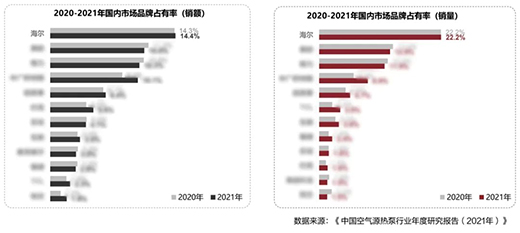 據(jù)《中國空氣源熱泵行業(yè)年度研究報(bào)告(2021)》數(shù)據(jù)顯示,2021年,海爾空氣源熱泵年度銷額和銷量的市場占比分別為14.4%和22.2%,奠定海爾中央空調(diào)在熱泵領(lǐng)域的領(lǐng)軍地位。