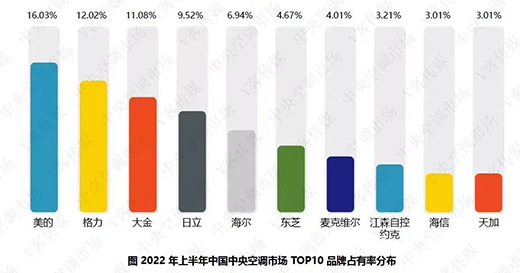 《中央空調(diào)市場》發(fā)布的數(shù)據(jù)顯示,2022年上半年,美的以16.03%的市場占有率位居行業(yè)首位,在離心機(jī)、螺桿機(jī)、模塊機(jī)組等冷水機(jī)產(chǎn)品中,美的市場占比均保持國產(chǎn)品牌領(lǐng)先。從跟隨者到領(lǐng)導(dǎo)者,從技術(shù)引進(jìn)到技術(shù)創(chuàng)新,美的不斷刷新著中央空調(diào)行業(yè)的“高度”,引領(lǐng)“中國智造”的發(fā)展。
