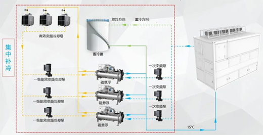 集中式補(bǔ)冷為間接蒸發(fā)冷AHU+磁懸浮離心機(jī)水系統(tǒng)相結(jié)合的聯(lián)合供冷模式,充分利用不同機(jī)組的優(yōu)勢(shì)互補(bǔ),從而實(shí)現(xiàn)數(shù)據(jù)中心最優(yōu)的PUE解決方案。