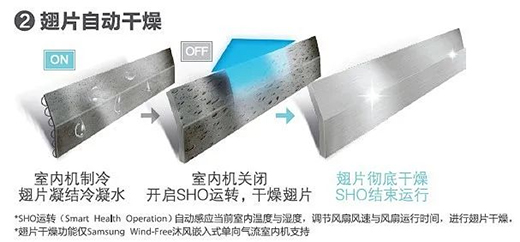 空調(diào)制冷時(shí),室內(nèi)機(jī)翅片上會(huì)凝結(jié)冷凝水,關(guān)機(jī)后,附在翅片上未及時(shí)排出的冷凝水隱藏在空調(diào)內(nèi)部,由此可能會(huì)滋生細(xì)菌,從而引發(fā)異味。SAMSUNG WindFree?沐風(fēng)嵌入式單向氣流產(chǎn)品三步干燥技術(shù),讓空調(diào)室內(nèi)機(jī)也能保持干凈。第一步,室內(nèi)機(jī)翅片涂層減少細(xì)菌附著,第二步,關(guān)閉空調(diào)時(shí)會(huì)自動(dòng)開(kāi)啟翅片干燥功能,干燥清潔翅片,防止霉菌滋生。第三步,冷凝水提升泵與止回閥,迅速排出冷凝水,配合止回閥一同避免冷凝水倒灌,防止積水盤滋生細(xì)菌。